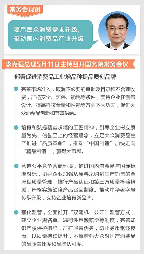 “我们不光要提升工业装备,做强重化工,同时要更加重视那些看起来很‘零碎’的小东西,推出更多适销对路的大众消费品,拉动‘消费’这个最终需求。”李克强总理在5月11日的国务院常务会议上说。 今年4月,李克强总理主持召开国务院常务会议部署装备制造业标准化和质量提升时,明确要求有关部门,要尽快拿出针对大众消费品的“质量标准”,以消费者选择倒逼工业消费品提质和“中国制造”升级。一个月后,促进消费品工业增品种、提品质、创品牌的相关文件就摆上了国务院常务会议的议事桌。 李克强说,要培育和弘扬精益求精的工匠精神,引导企业树立质量为先、信誉至上的经营理念,立足大众消费品生产推进“品质革命”,推动“中国制造”加快走向“精品制造”。 “现在已经不是计划经济时代了,消费品最终要接受市场的选择,消费品工业升级,最终要充分发挥市场的力量!”总理说。 1要用民众消费需求升级,带动国内消费品产业升级“千万不要小看这些小产品啊!‘中国制造’这些年行销全球,正是依靠这些‘小东西’,开拓了大市场!” “千万不要小看这些小产品啊!‘中国制造’这些年行销全球,正是依靠这些‘小东西’,开拓了大市场!”会议甫一开始,李克强提醒各位参会者,要深刻认识消费品工业升级的重要意义。 总理说,中国进入中等收入国家行列后,大众对消费品的需求正在转变升级。当前我国已经形成了覆盖面广、结构相对完整的消费品工业体系,但仍然面临高品质产品不足、产品种类不够丰富等问题。 “我听说现在好一点的饭店,还有中等收入以上的家庭,连刀具、剪刀等等,都要买欧洲的产品。还听人说,到发达国家的超市,能看到很多‘意想不到的东西’。”李克强说。为此,总理强调,消费品工业必须更加积极应对消费者的需求变化。要用民众消费需求升级,带动国内消费品产业升级。 李克强说,中国有13亿多的人口,进入中等收入者行列的家庭逐年在增加,消费升级的需求日趋旺盛,要紧紧抓住这一巨大的市场需求,释放这一任何国家都无法比拟的巨大消费力量。 2因为制度性交易成本太高,企业只能降低必要的成本投入,从而也就降低了产品质量“我跟企业负责人交流的时候,很多人反映,他们很欢迎减税、降费,但最关键的,还是希望简政减权,从而真正降低制度性交易成本。” 李克强说,改革开放以来,我们通过放开价格、取消票证,极大丰富了消费品种类。现在要推动消费品工业升级,各级政府当务之急要做好三件事。第一件事,就是要“改善营商环境”。 “我跟企业负责人交流的时候,很多人反映,他们很欢迎减税、降费,但最关键的,还是希望简政减权,从而真正降低制度性交易成本。”李克强说,“小微双创企业‘跑证’等各种时间太长了。因为制度性交易成本太高,企业只能降低必要的成本投入,从而也就降低了产品质量。” 他强调,促进消费品工业升级,需要政府的支持。但这个支持一定要支持到“点子”上。“关键还是要进一步推进简政放权、放管结合、优化服务,创造良好的营商环境。”总理说。 3“盖章”的权力坚决不放,监管还要让企业自己处理,这岂不是咄咄怪事?“只有好的监管,才有公平的竞争和健康的市场。” “给别人‘盖章’的权力坚决不放,但市场里面出现假冒伪劣、侵犯知识产权的情况,却不愿意管,还要让企业自己处理。这岂不是是咄咄怪事?”李克强说。他随即提出,推动消费品工业升级,政府要做好的第二件事就是“加强监管”。 总理举例说,他早年在地方工作期间,曾有食品企业无法确定采购猪肉的检疫章是否是“假章”,每年花费600万元用于重新检疫、次品焚烧。还有造酒企业,因为不堪“假酒”苦恼,只能自己搞防伪标识,自己请政府帮它们“打假”。 “结果是,制售假冒伪劣的没有受到惩罚,最后把正品给搞垮了,这是典型的‘劣币驱逐良币’!”李克强讲到这里加重了语气,“这种环境不改善,监管不加强,怎么能保护创新,怎么能推动消费品工业升级?” 总理还谈起了几年前在瑞士考察家庭农场时,当地负责人介绍,他们为了保障食品安全,一年只对各农场开展两次检查,一次是固定时间的“普查”,另一次则是通过“摇号”的随机抽查。一旦发现产品不合格,轻则取消农业补贴,重则永久逐出市场。 “只有好的监管,才有公平的竞争和健康的市场。”李克强强调。 4别说鼓励支持企业创新了,连市场大门都进不来啊!“政府要认真研究,真正做好自己该做的工作,其它的就交给市场。尽最大可能调动企业积极性,释放市场活力。” 总理强调的第三件事,是“完善市场准入”。 今年1月,李克强总理在山西考察期间,一位创业者向总理介绍,他们研发的太阳能摩托车采用全新技术,储能量和续航时间都大大延长,在海外市场卖得不错。但因为技术太新,没有被列入相关产品目录,目前无法进入国内市场。 “我当时就问他,其它国家没有给你设置‘产品目录’吗?他告诉我,其他国家没有‘产品目录’。但如果消费者使用产品出了问题,企业要负责赔偿。”5月11日的常务会议上,李克强总理重提当时的情景说,“现在我们市场准入目录太多了,很多创新的产品都没法卖!别说鼓励支持企业创新了,连市场大门都进不来啊!” 李克强指出,当前我们正处在技术剧烈变革、创新蓬勃发展的时代。“各种定制化产品层