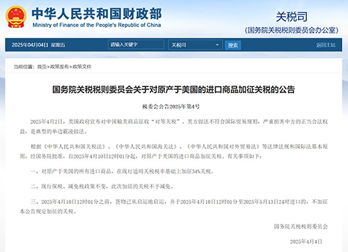 中国对原产于美国的进口商品加征关税 2025-4-7 来源:财政部网站