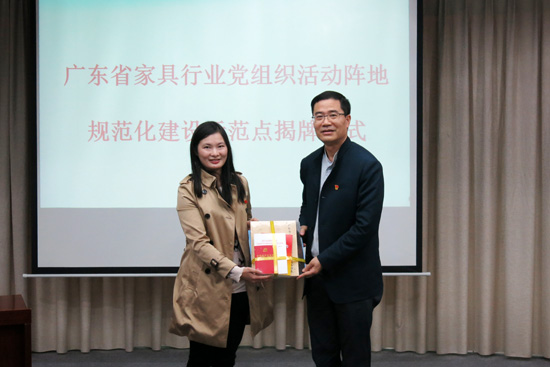 12月27日,中共广东省家具协会支部委员会书记王克,宣传委员张靖怡、组织委员梁杰雯一行前往佛山维尚家具制造有限公司,进行“广东省家具行业党组织活动阵地规范化建设示范点”揭牌仪式。维尚家具公司董事付建平、党总支部书记曾丹、副书记叶敏珊、组织委员石志新、纪检委员黄茵茵和一、二厂支部书记任栋梁参加揭牌仪式和座谈交流。