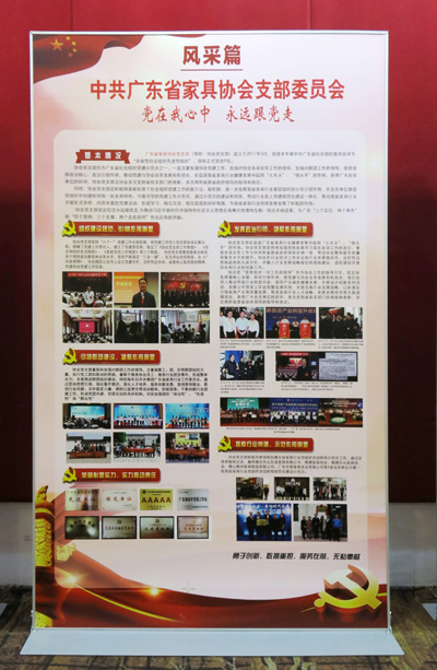 7月2日,在省社会组织党委召开庆祝中国共产党成立97周年——“社会组织跟党走”系列活动动员暨2018年度“七一”表彰大会期间,广东省家具协会党支部积极参与“广东省社会组织党建成果展”,全面展示协会党建工作成果。 本次党建成果展是省社会组织党委在430个全省性社会组织党组织范围内开展“庆祝中国共产党成立97周年——‘社会组织跟党走’系列活动”之一,共展出展示面板29块,照片800多幅。通过五大篇章,全面展现社会组织党委建立以来我省社会组织党建工作主要做法、主要成绩以及社会组织示范点党建工作情况,在社会组织领域持续营造学习党的理论、宣传党的政策、落实党的部署,听党话、跟党走的良好氛围,促进社会组织党组织规范化建设,提高党的组织和党的工作覆盖质量。