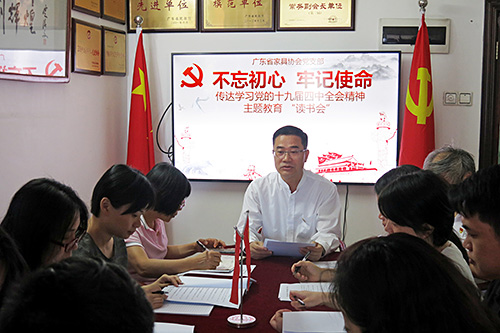 11月4日,广东省家具协会党支部召开“不忘初心、牢记使命”第二期专题教育“读书会”,及时传达学习党的十九届四中全会精神。广东省家协党支部书记王克主持会议,支部全体党员及入党积极分子参加。