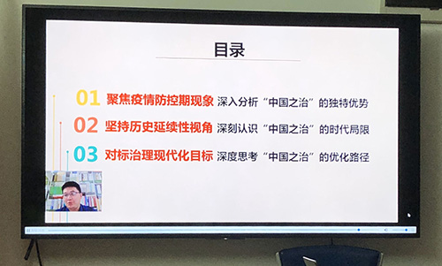 此次在线培训邀请到了广东省委党校/广东党建研究所副教授吴记峰讲授题为《新冠病毒肺炎疫情防控中看中国之治的独特优势》。课程主要按照:聚焦疫情防控期现象深入分析“中国之治”的独特优势;坚持历史延续性视角深刻认识”中国之治”的时代局限;对标治理现代化目标 深度思考“中国之治”的优化路径三点展开 吴教授还从新冠病毒疫情的发生到防控的各种现象结合中国特色社会主义制度、中国特色社会主义理论等方面讲述了中国之治的独特优势,结合新冠病毒疫情的案例让学员思考并学习新冠病毒中的“领导者”、“冲锋者”、“逆行者”、“无畏者”、“无私者”、“担当者”、“守护者”、“志愿者”等人身上的正能量,作为一名党员在大是大非面前应该如何发挥一个党员的先锋带头作用。