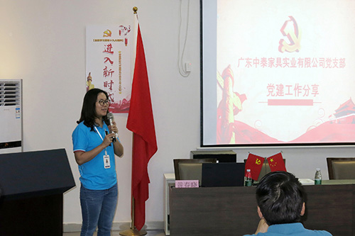 接着,中泰家具公司党支部书记黄春晓介绍企业基本情况及党支部工作开展情况。围绕四抓促四融,努力提升公司党建有位更有为展开分享党建工作的主要做法。一、抓规范建设强堡垒,建设融情型党组织;二、抓优化服务促发展,打造融合式党建工作平台;三、抓党工共建聚合力,建立融通化工作机制;四、抓回馈社会建和谐,构建融洽型党群关系。通过三必谈三必访的党建模式和党建带工建带团建带妇联的形式,联系企业的实际情况,通过学习全国党代表程祖彬的先锋模范作用带动党员积极学习和开展工作。