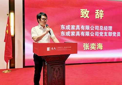 东成家居总经理张奕海致欢迎词,对广东家协多年来的支持和今天的“传经送宝”表示由衷地感谢,对王克书记一行的到来表示热烈欢迎,对家协推进行业党建示范点的工作表示全力支持。同时,希望企业党支部要以此为新契机,更加笃定、实干、争先,在以高质量发展推进中国式现代化新征程中,展现企业的新担当新作为。