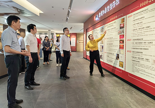 会前,王克书记一行在东成家居总经理张奕海的陪同下,参观了中山市工业旅游示范点、中国红木家具特色小镇文旅名片——东成红木文化体验馆。在为庆祝建党一百周年全新设立的党建文化长廊墙前,大家驻足观看。从2013年东成家居党支部正式成立,到2017年成为全省家具行业党组织活动阵地规范化建设示范点这一具有里程碑意义的举措,企业通过“抓基础建设、抓多元活动、抓工作落实”加强党建取得的成绩,全面展现了东成家居党建十余年的发展历程。