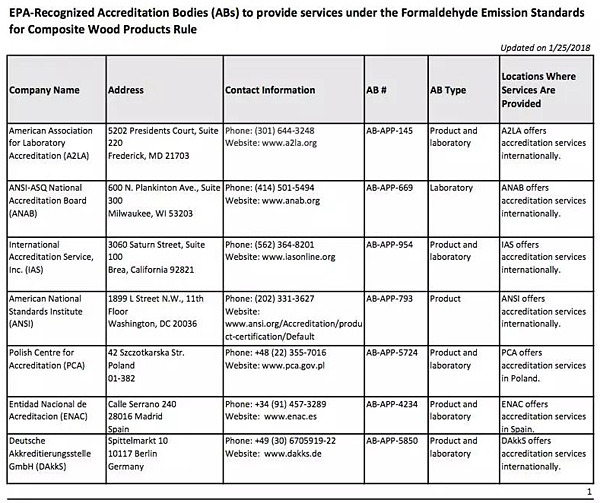 截至2018年1月25日,该清单中共公布了包括CNAS在内8家认可机构信息,另7家认可机构分别来自美国(4家)、波兰(1家)、西班牙(1家)、德国(1家)。 2016年12月10日,美国环保署发布《复合木制品甲醛释放标准》,提高了美国本土生产或进口的复合木制品的安全标准和准入条件,成为美国最严苛的甲醛排放限量规定。这对我国输美木制品出口形成了贸易技术壁垒,冲击我国木制品出口。规定明确,胶合板、刨花板以及纤维板等复合木制品及其成品,必须通过EPA承认的认证机构的认证后,方可在美国本土销售。成为EPA承认的认证机构的前提条件是该认证机构及其分包或自有检测实验室通过EPA承认的认可机构的认可。 为促进中国复合木制品顺利出口美国,促进中国认证和检测结果得到EPA承认,经国家认监委批准,CNAS主动跟踪研究EPA复合木制品甲醛释放限量相关法案及标准要求,研发建立了EPA复合木制品认证机构和检测实验室认可两项认可制度,并于2018年1月获得了承认。 CNAS正式成为美国环保署承认的复合木制品排放标准认可机构,将为我国木制品对美出口发挥积极作用。目前,凡是获CNAS认可的各相关认证机构和检测实验室,可直接申请美国EPA承认。获得承认后,这些检测认证机构颁发的证书或报告,可帮助我国木制品生产企业的产品顺利出口美国。
