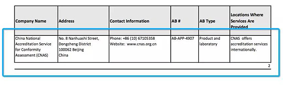 上图为EPA官网上认可机构列表,CNAS已被增加。