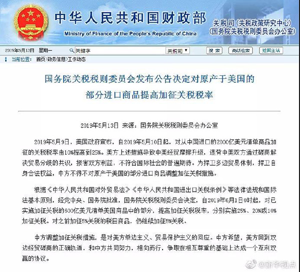 国务院关税税则委员会发布公告决定对原产于美国的部分进口商品提高加征关税税率 2019-5-14 来源:经济日报