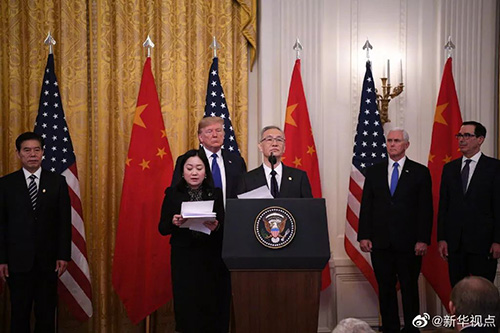 中共中央政治局委员、国务院副总理、中美全面经济对话中方牵头人刘鹤在中美第一阶段经贸协议签署仪式上致辞时说,达成第一阶段经贸协议,有利于中国,有利于美国,有利于全世界。
