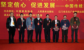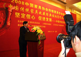 会议期间举行了“中国传统家具收藏经典”伍炳亮作品珍赏首发式,活动热烈有序。伍氏兴隆明式家具艺术有限公司董事长、明式家具设计大师、传统家具专业委员会副主任伍炳亮先生将他近三十年间所制作的古典家具精品,用了近4年的时间精心设计,制作成精美图册,赠与了中国家具协会、中国国家博物馆、中国收藏家协会收藏。三家单位也先后为伍炳亮先生颁发了证书。原轻工部副部长、中国轻工业联合会副会长张善梅为伍炳亮先生颁发了荣誉奖杯。许多领导和嘉宾代表讲话致辞,高度肯定了伍炳亮先生的精美作品珍赏图册以及他为中国传统家具行业做出的贡献。 会后,召开了“坚定信心,促进发展——中国传统家具高峰论坛”。论坛邀请了中国家具协会理事长贾清文、副理事长陈宝光、中国文物学会常务理事专家委员、原故宫博物院研究员胡德生、伍氏兴隆明式家具艺术有限公司董事长伍炳亮、北京元亨利古典家具有限公司总经理杨波五位先生作为演讲嘉宾。他们围绕“坚定信心,促进发展”这一主题,结合他们自己所了解的2008年实际情况,针对国际国内经济形势,分别做了精彩演讲。其中,贾清文理事长和陈宝光副理事长从不同角度,多层面的剖析了当前经济形势,并鼓励传统家具企业要坚定信心,强化自己,做出品牌,做出特色,迎接挑战,增加战胜困难的信心和勇气,团结一心,共同迎接2009年新的挑战与机遇。
