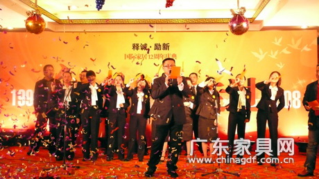 2008年12月28日,东莞厚街国际家私城举行隆重热烈的12周年庆典。省家协王克秘书长、东莞名家具俱乐部尹成枝理事长等行业领导应邀出席。图为梁劲松总经理带领管理层员工倾亲演绎“真心英雄”。