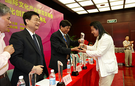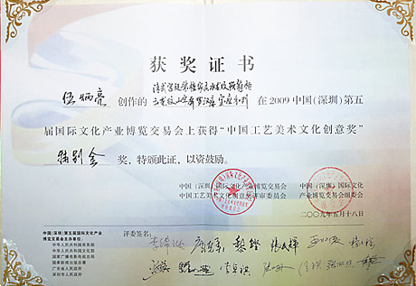 伍氏兴隆在第五届文博会中分别荣获一个金奖、与最高奖项“特别金奖”,文化部领导李小磊、广东省文化厅领导方键宏、广东工艺美术协会领导张春雷向伍炳亮先生颁奖。