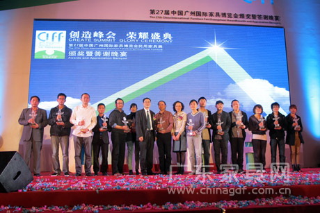 第27届中国广州国际家具博览会第一期展会,包括民用家具展、户外及休闲用品展、家居饰品/用品展、家用纺织品及辅料展已于3月21日圆满闭幕。本届广州家具展以傲人的54万平方米超大规模,近3200家展商的超强阵容,华丽登场,在规模和参展商数量上再创新高,其规模之大、展览质量之高,形成了难以超越的行业影响力和号召力。 20日晚举行的颁奖暨答谢晚宴,上千名中国家具业精英聚首香格里拉大酒店,把酒言欢、共叙友谊,共同见证了中国家具行业又一系列获奖明星,在第27届中国广州国际家具博览会颁奖暨答谢晚宴的舞台上闪耀诞生。 中国家具协会理事长朱长岭、副理事长兼秘书长张冰冰、副理事长陈宝光,中国对外贸易中心副主任、中国对外贸易中心(集团)董事、副总裁任向东,广东省家具协会会长王克,中国对外贸易广州展览总公司总经理李德颖等行业领导和领导出席晚宴,祝贺广州家具展赢尽行业口碑、持续健康发展,寄望第二期办公环境展、木工机械、家具配料展及9月秋季广州家具展能延续精彩,再创佳绩,为家具业的繁荣贡献出更大的力量。