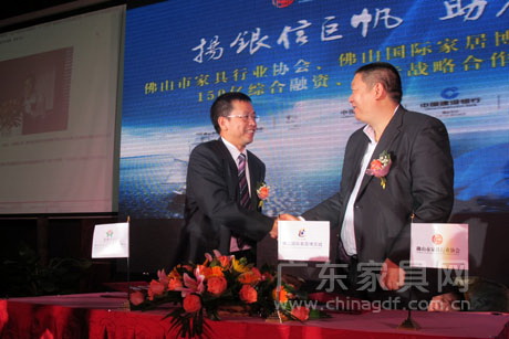 签约仪式上,广东省家具协会会长王克表示此举将为家具行业的发展注入了强心剂,值得推崇和推广,广东省家具产业仍然是具有优势的传统产业,亦是长青产业,在新的一轮转型升级过程中,不但需要基础创新、管理创新,更需要资金支持,本次融资将掀起合作的新起点,为助力佛山家具行业的发展作出重要的贡献。 据了解,由大卖场和行业协会牵头为家具企业申请综合融资合作在国内家具行业内尚属首次。参与此次战略合作签约的银行包括佛山市禅城区农村信用合作联社、中国工商银行佛山分行股份有限公司、中国农业银行股份有限公司佛山分行、中国银行佛山分行、中国民生银行、中国建设银行股份有限公司佛山市分行。150亿的综合融资金额,将面向佛山乃至全国的家具企业。