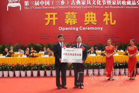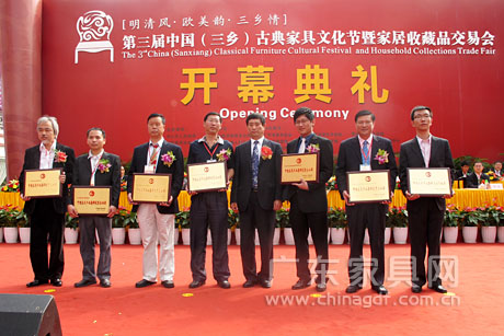广东省家具产业集群建设工作再上新台阶。10月28日,在第三届中国(三乡)古典家具文化节暨家居收藏品交易会开幕式典礼上,中国家具协会向中山市三乡镇颁发“中国古典家具名镇”牌匾。 据了解,作为全国最大的古典家具集散地,中山市三乡镇2008年通过共建这一模式,加大了对古典家具产业的扶持和引导力度,举办中国(三乡)古典家具文化节,壮大了古典家具产业,提升了三乡的综合竞争力,进而引领中国古典家具产业发展。2011年8月11日,中国家具协会组织的专家考评组,认为三乡镇的明清古旧家具和欧美古典彩漆家具在全国同类家具市场中规模最大,三乡镇家具产业集群符合中国轻工联合会和中国家具协会对于特色区域荣誉称号的要求,同意授予三乡镇“中国古典家具名镇”的荣誉称号。2011年10月14日,中国家具协会在北京召开中国家具产业集群工作会议,正式命名三乡镇为“中国古典家具名镇”。