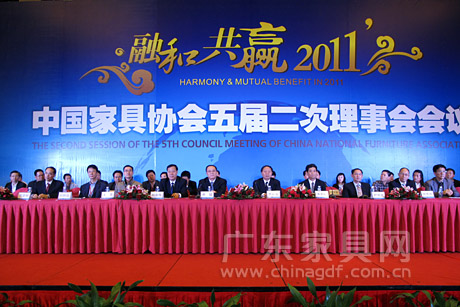 “融和共赢2011”中国家具协会第五届二次理事会会议12月22日在广州长隆会议中心隆重召开。全国政协委员、全国政协提案委副主任、中国轻工业联合会会长步正发,中国家具协会理事长朱长岭,广东省城镇集体企业联社主任、广东省家具协会名誉会长舒海波,中国家具协会副理事长兼秘书长张冰冰、副理事长刘金良、副理事长陈宝光,中国家具协会副理事长、广东省家具协会会长王克等行业领导以及来自全国各地家具行业的代表出席会议。