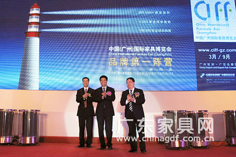 中国对外贸易中心(集团)王彦华副主任、中国家具协会朱长岭理事长、广东省家具协会王克会长共同启动“中国广州国际家具博览会新形象”。