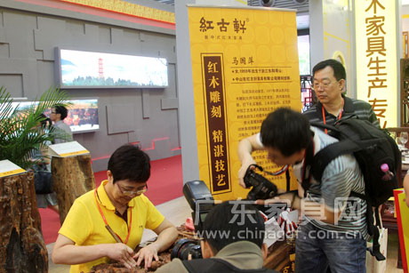 展位现场,伴随着优美的古典音乐,雕刻技师马国萍正娴熟地、深浅错落有致地、赋予审美与情感地雕刻着摆置身前的红木面板;众多重量级大师之作《西游记》正栩栩如生、淋漓尽致地再现唐三藏师徒——唐僧、孙悟空、猪八戒、沙悟净四人西天取经,历经九九八十一难取得真经,修成正果的过程;多款彰显红木家具材优艺精的红木精品也同台演绎……传统红木雕刻工艺的精湛与高超、红木文化的博大与精深,红古轩将全场人气提升到最高点。 中山市文广新局局长郑集思表示,此次选红古轩作为中山的代表参加文博会,其一是近年来中山正践行着加快创新步伐建设“三个适宜”新型城市的大胆尝试,红古轩作为其中的佼佼者,先是登上早些年的全国九运会;其次登上2010年第16届亚运会;再到登上世界舞台——全球家居创新大奖,它是创新的最突出代表;其二是红木家具产业做为中山的优秀传统产业代表,发展势头强劲,红古轩作为龙头企业,同时有着诸如镇山之宝《西游记》等许多精品,更能展现艺术的魅力、文化的魅力、中山的魅力。于此,相信大家能深切地感受到传统是如何与创新浑然一体,创造出征服世界的艺术与精神的。出色的标签、非凡的感悟,这是我们中山展位的定位。