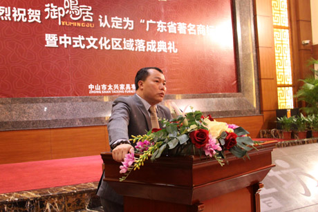 典礼上,太兴家具总经理李兴畅说,“御鸣居”品牌被认定为“广东省著名商标”是继2010年,其兄弟品牌“轩红坊”荣获“广东省著名商标”后的又一喜讯,是太兴家具十五年来坚守“品牌立企”战略的骄人成果。随后,中山团市委书记麦升涛、广东省青企副会长兼常务副秘书长向阳、广东省家具协会会长王克分别上台表示祝贺并致辞,王克会长表示,在家具行业中,旗下品牌双双荣获-广东省著名商标荣誉并不多见,太兴家具是具有代表性的一例。