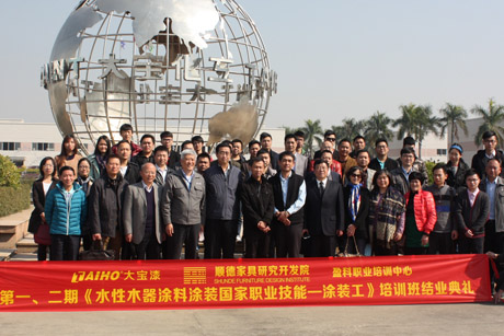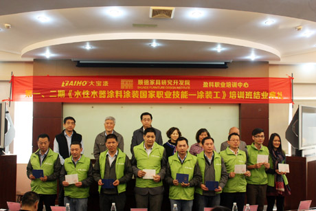 1月23日上午,顺德家具研究开发院首期、二期水性木器涂料涂装工培训班结业典礼在东莞大宝化工总部举行。28名学员接过由国家劳动和社会保障部颁发的中级工、高级工国家职业资格证书,这标志着中国首批水性木器涂料涂装技术工人的诞生。 国家化工行业生产力促进中心主任王翊民、国家标准出版社主编王虹、广东省涂协黄永汉主任、华南理工大学涂伟萍教授、大宝公司陈春华总经理,28名结业学员及第三、四期学员代表,家具、涂料企业代表近百人出席。