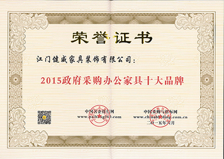 2015年7月,由中国采购与招标网(国家发改委四号令授权中国政府唯一指定发布招标公告网站)、中国名企排行网(中国第一个专业招标采购评价网站)联合举办的“2015(第七届)中国办公家具招标采购评价推介活动”落下帷幕,主办方依据办公家具招标采购大数据,秉承“公开、公平、公正”的招投标原则,推出2015中国最具投标实力办公家具供应商百强等系列榜单。广东省家具协会执行会长单位——江门健威家具装饰有限公司(以下简称健威家具)凭借精良的产品质量、优质的诚信经营和良好的品质服务,荣获 “2015政府采购办公家具十大品牌”、“2015中国办公家具定制十大品牌”、“2015中国办公家具绿色品牌”、“2015中国办公家具品质服务十佳品牌”等四项大奖。再一次印证了健威家具强大的品牌实力与企业竞争力,也是对健威家具在企业发展和社会贡献中所做努力的肯定。