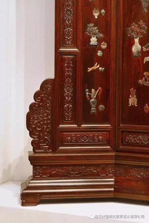从2007年至今,伍炳亮先生携其中国传统家具作品已连续参加了十一届“文博会”,连续十一次蝉联并获取了12项“中国工艺美术文化创意奖特别金奖”,在这项国内工艺美术类的最高奖项上,创下了“十一连冠”的记录。作为有“岭南鲁班”美誉的中国工美艺术大师,伍炳亮出色地继承了广作家具一直以来所坚持的不断革新、兼容并蓄的广作精神。虽然身处岭南,伍炳亮的家具风格并不拘于某一地域、某一时代,而是博采众长,将广作、京作、苏作这几大中国传统家具的流派熔冶一炉,取其精华而弃其糟粕,最终形成了自己朴茂醇和、沉穆渊深的个性风格特征。正因为其海纳百川、兼容并蓄的精神,伍炳亮先生虽然以明式家具,尤其是明式黄花梨家具设计大师的身份而闻名于世,但同时他设计制作的清式家具亦是其不容小觑的强项。