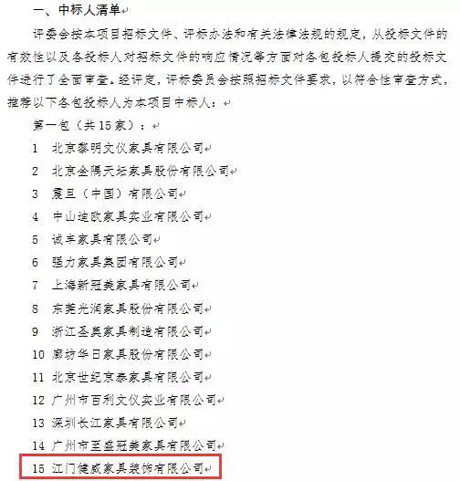据中央政府采购网、家具采购网消息,5月31日,中央国家机关政府采购中心公布了中央国家机关2017-2018年办公家具定点采购项目中标公告,广东省家具协会执行会长单位、江门健威家具装饰有限公司等15家公司成为国管局定点采购单位。本项目共4包,共有100家投标人参与,其中第一包17家,第二包46家,第三包9家,第四包45家(各投标人部分投报多包)。各包投标人均符合招标文件密封要求。