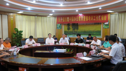 在考评工作汇报会上,东升镇党委副书记、镇长黄少平从发展历程、发展优势、发展思路等方面详细介绍了东升镇办公家具产业建设情况。中山市东升办公家具行业协会会长姚永红介绍了协会在加强行业自律、规范行业标准、促进企业提高产品质量、提升行业整体竞争力等方面的工作。