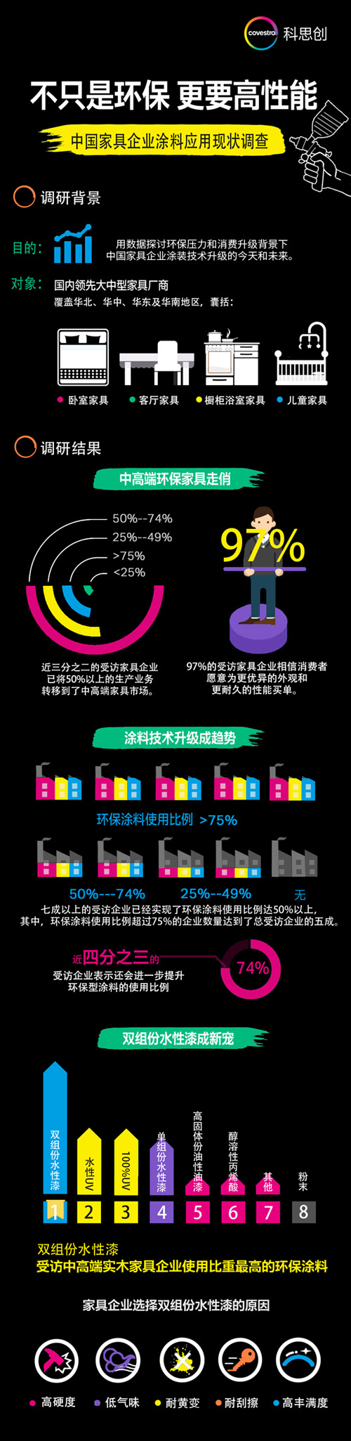 近年来,国家以及地方陆续颁布多项环保新政,要求减少挥发性有机化合物(VOC)排放,涂料行业也大力推动环保型涂料的发展。作为涂料行业的下游产业之一,家具业也受到了诸多政策的影响;此外,消费升级带动了绿色家居的新需求。在双重推动之下,一批对市场敏感的家具企业率先高比例使用环保型、低VOC涂料。 《中国家具企业涂料应用现状调查》由科思创和新浪家居共同发起,向全国范围内标杆性大中型家具企业定向发布调研问卷注(注1)。主要调研结果如下: 中高端环保家具日益受宠,消费者愿为高品质买单 在日常运营中,中国家具企业面临着来自各方各面的挑战,而激烈的市场竞争被认为是当下最严峻的问题(63%)。这也促使越来越多的家具企业开始寻求突破与转型,近三分之二的受访大中型家具企业已将50%以上的生产业务转移到了以实木制造为主的中高端家具市场。根据调研结果显示,几乎所有的家具企业都认为消费者愿意为更加优异的外观和耐久的性能付出更高的价格。在实际销售中,也有近90%的家具企业会向消费者介绍涂料的品质和差异。由此可见,在新的市场格局下,大中型企业已将产品材料创新和差异化作为抢占市场制高点的利器,以此争取先入为主的市场效应。 涂料技术升级势不可挡,厂商首选双组份水性漆 为了企业的转型升级以及更好的未来发展,超过80%的受访企业已开始使用更加环保的高品质原辅材料,超过60%的受访企业已积极升级水性涂装线等生产设备。对于家具涂装方案,家具企业对涂料的性能以及外观效果最为重视,并认为水性涂料的性能是决定能否成功实现涂料转型至关重要的一点(74%)。 国内一些领先的家具企业已经先行实施了涂料升级,龙头企业积极使用环保涂料的行为也将带动广大中小企业转换环保涂料的热情。七成以上的受访企业已经实现了环保涂料使用比例达50%以上,其中,环保涂料使用比例超过75%的企业数量则达到了总受访企业的一半以上。近四分之三的受访企业表示还会进一步提升环保型涂料的使用比例。目前,双组份水性漆是受访家具企业使用比重最高的环保型涂料(42%)。低气味、高硬度、耐刮擦、耐黄变、耐污渍、高丰满度是家具企业选择双组份水性漆最主要的原因。特别是实木家具,由于其外观设计及选材的特殊性,对涂装工艺的要求也更高,尤其需要双组份水性漆这类高性能的新型环保涂料。 引领高效水性化改造,科思创助力品牌升级 相较成熟的欧美市场,中国的水性家具漆正处于发展的关键时期。就国内家具行业整体而言,水性家具漆市场占比仍不足10%。科思创涂料、粘合剂及特殊化学品业务部大中华区副总裁陆伟国先生表示:”通过整个产业链的共同努力,国内家具市场的佼佼者已纷纷通过应用高性能的双组份水性涂装,调整中高端产品的占比,从而提升品牌在市场上的竞争力。我们预计 2015 – 2020年期间,水性家具涂料在中国市场的增长率将高于20%,而高性能双组份水性漆的增长率还会更高,尤其是在对外观及性能有较高要求的实木家具领域大有作为。“ 科思创作为聚氨酯技术的发明者,其高性能双组份水性聚氨酯技术Bayhydur® + Bayhydrol®成功解决了水性涂料所面临的传统技术难题,并在硬度、耐刮擦、耐污渍、耐黄变、耐湿热及高亮光涂装效果等方面表现出优异的性能,在卧室、客厅、橱柜浴室及高端儿童家具等领域应用优势明显。 通过与家具产业链中的涂料企业、涂装设备和喷枪配套企业紧密合作,科思创致力于帮助国内家具企业高效地转水性。家具企业可以选择最适合的水性涂料技术和涂装方案,以更完备的商业模式、更具优势的生产流程和工艺,突破创新和可持续发展的界限,成为环保家具行业的领导者和风向标。 请访问科思创官网 ,了解更多转水性成功案例。 注1:本次调研向42家大中型以实木类家具为主的厂商定向发布,回收问卷38份,有效问卷38份。这些家具厂商覆盖全国三十余个重点城市,囊括卧室家具、客厅家具、橱柜浴室家具及儿童家具等各门类,并在各自的领域中均处于市场前列。 关于科思创 科思创是全球最大的聚合物生产公司之一,其2016年度销售额达到119亿欧元。其业务范围主要集中在高科技聚合物材料的生产制造及用于诸多日常生活领域的创新性解决方案的研发。主要服务行业涵盖汽车、建筑、木材加工和家具、电气和电子、体育休闲、化妆品、医疗以及化工行业本身。科思创前身为拜耳材料科技,截至2016年底,在全球拥有30家生产基地、约15600位员工(按全职员工计算)。