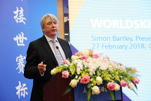 世界技能组织主席西蒙·巴特利以《架桥——技能大赛、职技教育、产业发展》为主题,介绍了世界技能组织、世界技能竞赛的标准规范以及如何更好的进行技能推广。他指出,大家共同努力,以技能的力量,让世界更美好,提高技术人才的知名度和认可度,展示技能对经济增长和个人成功的重要性。