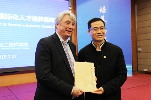 2月27日,由广州市轻工技师学院主办的“世赛标准与家具行业国际化人才培养高峰论坛”在广州举行。本次论坛邀请了世界技能组织主席西蒙.巴特利、国家人社部职业能力建设司司长张立新、广东省人社厅副厅长杨红山、广州市人社局副局长何士林、中国家具协会副理事长刘金良、广东省家具协会会长王克、广州市家具协会秘书长陈允、第44届世界技能大赛家具、精细木工、木工项目中国技术专家组长及20多家知名家具企业代表一百余人参加。