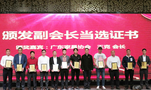 原人力资源和社会保障部副部长杨志明,中国林业产业联合会副会长封加平,广东省人大代表、广东省家具协会会长王克,广东省家具协会副会长李礼,中国家具协会传统家具专业委员会秘书长姜恒夫等分别为新一届理事会、监事会成员颁发证书。