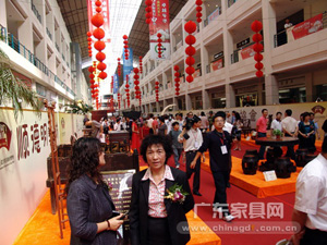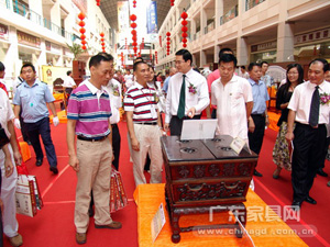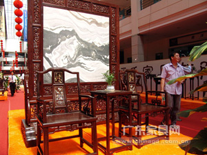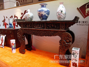 在展会现场,省、市、区三大鉴藏家协会鼎力协作,数十名收藏家倾力支持,镇宅之宝悉数登场,展现广式收藏的力量。包括如火烧云般华丽的黄花梨瘿木箭腿条案、黄花梨瘿木五足香几(价值约800万元人民币)、珍贵罕见的 “九龙·瑞图” 万年古象牙(价值约800万元人民币)以及一批从美国回流的罕见红木家具等等。这些古旧的红木家具作为历史的器物,在辗转人世间的历史沧桑变化之中,隐隐透露出昔日无上的辉煌与荣耀。而代表华南地区顶级的红木家具生产工艺和设计理念的品牌企业——瀚江古典、区氏家具、明艺坊、佛缘……,他们也为红木家具爱好者带来经典的镇店之宝和09年新款红木家具创新名作,集中展现了精湛的工艺和深厚的文化底蕴。