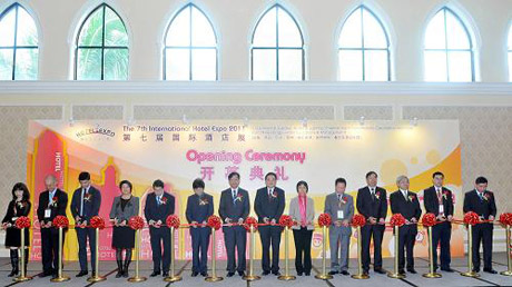 11月23日,嘉宾出席第七届国际酒店展的开幕剪彩仪式。第七届国际酒店展于11月23日至25日在澳门威尼斯人会展中心举行,近100家来自中国、加拿大、法国、日本和美国等地的参展商出席,展区面积约5000平方米。新华社记者 张金加 摄