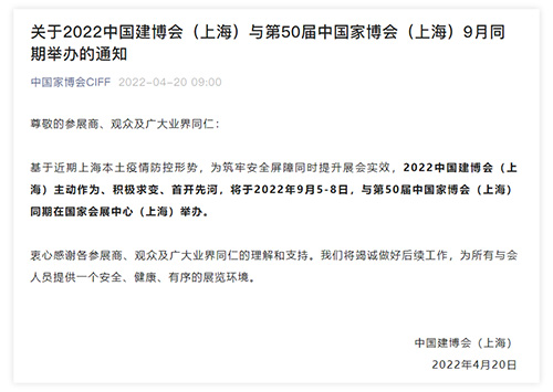 关于2022中国建博会(上海)与第50届中国家博会(上海)9月同期举办的通知