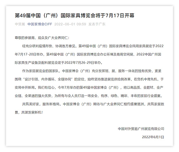 尊敬的参展商、观众及广大业界同仁: 经充分研判疫情形势、协调各方意见,第49届中国(广州)国际家具博览会民用家具展定于2022年7月17-20日举办,第49届中国(广州)国际家具博览会办公环境及商用空间展、2022中国广州国际家具生产设备及配料展览会定于2022年7月26-29日举办。 作为家居展览业的国家队,中国家博会(广州)充分发挥馆、展、服务一体化的独有优势,紧紧围绕“设计引领、内外循环、全链协同”的定位,始终坚持推进展览供给侧改革,在危机中育先机,于变局中开新局。我们有信心,今年7月举办的第49届中国家博会(广州),将以高品质、全题材、全产业链、全渠道的强大优势,为所有与会人员打造一场安全、有序、绿色、精彩、丰收的家居行业盛宴。 共筑美好家,服务新格局。中国家博会(广州)期待与广大业界同仁相约盛夏琶洲,共筑家居胜景,共谋发展新机!
