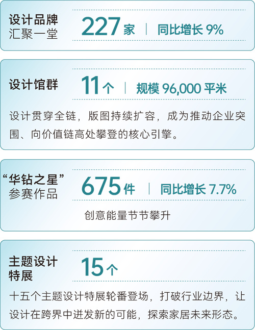 “创”见未来 设计引领价值向上 设计是提升产业附加值、引领消费升级的核心动力。本届展会设计创新活力迸发,从点、线、面构建一个从原创发布、资源链接到商业落地的完整赋能生态,推动中国家居从“制造”向“创造”跃升。