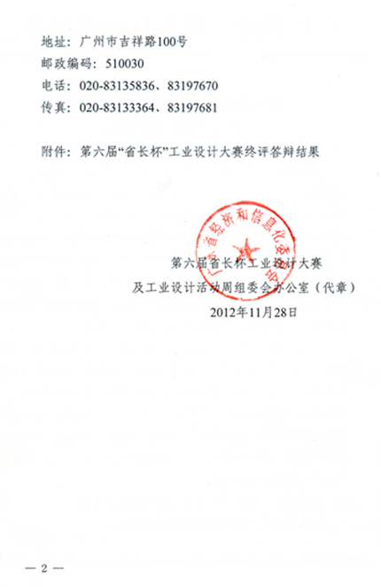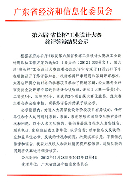 根据省府办公厅《印发第六届省长杯工业设计大赛及工业设计周活动工作方案的通知》(粤办函[2012]333号文),第六届“省长杯”工业设计大赛组委会组织评审专家于11月23日下午在顺德召开了终评答辩会。根据答辩评审规则和答辩评审标准,大赛总评得分前12名的参赛项目参加了现场答辩,经大赛专业评审委员会及评审专家进行终评合议听证,评出了大赛一等奖1个、二等奖3个、三等奖6个,落选的2个项目获得大赛优胜奖。经大赛组委会办公室审核,现将终评答辩结果予以公示。
