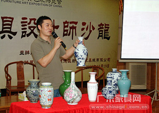 为了提升对传统家具文化的认识,形成中国现代家具的新风格,形成中国新一轮的消费热潮,沙龙上首先进行了对古旧家具和景德镇瓷器的鉴赏。瀚江古典家具萧勇总经理、新乐从家具城有限公司胡柯总经理分别就仿古家具的鉴赏与收藏、中国仿古瓷器的鉴赏与收藏为大家进行了详细的讲解,然后大家各抒己见,对如何继承和发扬传统家具文化以及在现代生活中如何将传统家具、瓷器与室内装饰融为一体两个话题提出自己的见解,在轻松愉快的氛围中进行交流。