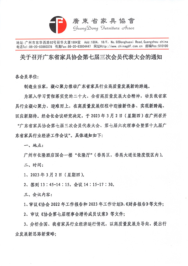关于召开广东省家具协会第七届三次会员代表大会的通知