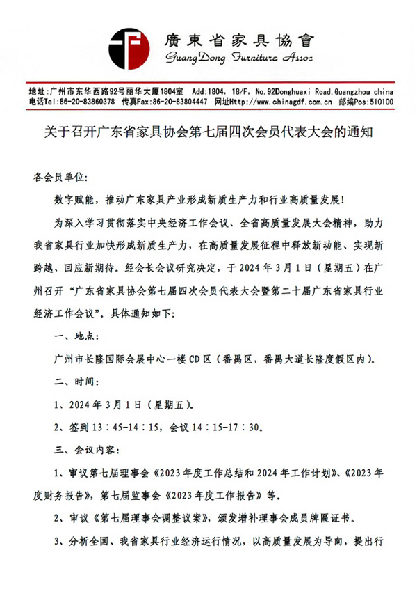 关于召开广东省家具协会第七届四次会员代表大会的通知