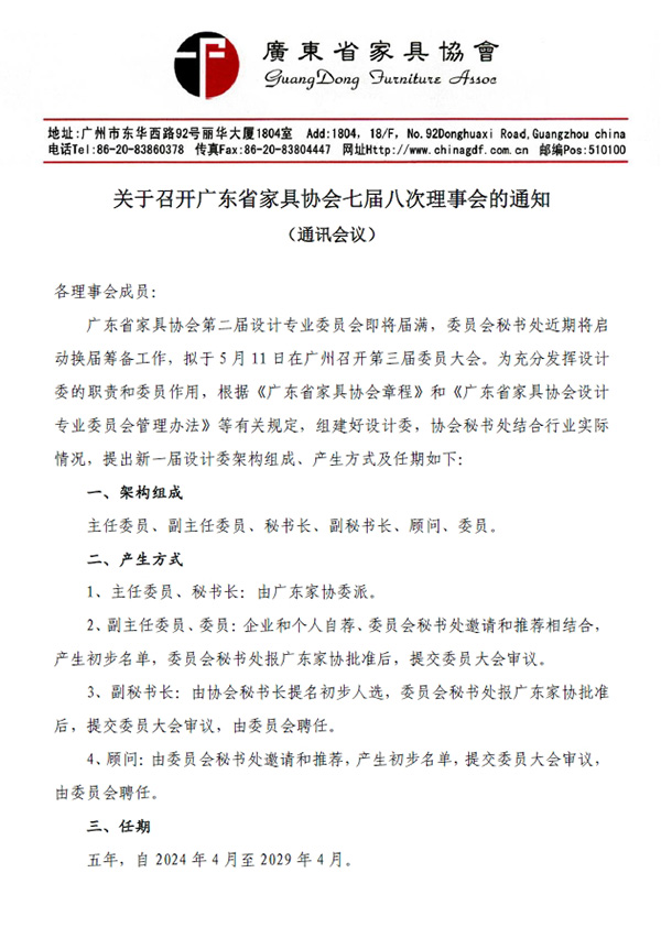 关于召开广东省家具协会七届八次理事会的通知 (通讯会议) 各理事会成员: 广东省家具协会第二届设计专业委员会即将届满,委员会秘书处近期将启动换届筹备工作,拟于5月11日在广州召开第三届委员大会。为充分发挥设计委的职责和委员作用,根据《广东省家具协会章程》和《广东省家具协会设计专业委员会管理办法》等有关规定,组建好设计委,协会秘书处结合行业实际情况,提出新一届设计委架构组成、产生方式及任期如下: 一、架构组成 主任委员、副主任委员、秘书长、副秘书长、顾问、委员。 二、产生方式 1、主任委员、秘书长:由广东家协委派。 2、副主任委员、委员:企业和个人自荐、委员会秘书处邀请和推荐相结合,产生初步名单,委员会秘书处报广东家协批准后,提交委员大会审议。 3、副秘书长:由协会秘书长提名初步人选,委员会秘书处报广东家协批准后,提交委员大会审议,由委员会聘任。 4、顾问:由委员会秘书处邀请和推荐,产生初步名单,提交委员大会审议,由委员会聘任。 三、任期 五年,自2024年4月至2029年4月。 现以通讯形式召开七届八次理事会,请各理事会成员审议表决,如有异议,请于4月16日17:00前书面回复本会秘书处,没有回复将视为同意。 联系人:张靖怡、辛宝珊; 广东省家具协会