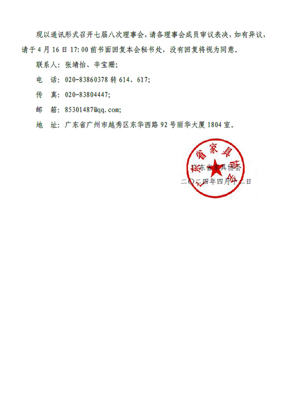 关于召开广东省家具协会七届八次理事会的通知(通讯会议) 2024-4-12 来源:广东省家具协会