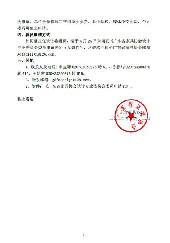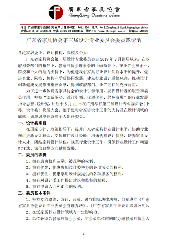 各泛家居企业、设计机构、院校及个人: 广东省家具协会第二届设计专业委员会自2019年8月换届以来,在政府相关部门的指导下,省家具协会理事会的正确领导下,在业界会员企业、院校和个人的鼎力支持下,为促进我省家具行业设计创新水平的提升,促进企业、院校、机构产学研协同发展,建立行业设计道德风尚,推动设计创新健康发展作出重要贡献,得到政府部门、业界同仁的充分肯定。 为了进一步体现省家具协会的设计引领作用,发挥设计委的职责和委员作用,坚持“创新驱动、设计引领、优质优价、绿色发展”的行业发展指导思想。经研究,计划于5月11日在广州举行第三届设计专业委员会(下称:设计委)换届大会。鉴于您对省家协设计工作的支持及在设计领域的成就,诚邀您单位或您个人出任委员。 一、设计委宗旨 在国家方针、政策指导下,提升广东省家具行业设计水平,协助行业探讨更新设计理念,交流推广设计经验,沟通传播设计信息,培养家具设计人才,团结家具设计队伍,规范行业设计工作,引领行业设计工作朝遵纪守法、诚信自律方向健康发展。 二、委员的职责 1、拥有表决权和选举、被选举的权利。 2、拥有优先、优惠参加设计委举办的各项活动的权利。 3、拥有优先、优惠享用设计委提供的各项服务的权利。 4、拥有对设计委工作提出建议和监督的权利。 5、拥有申请入会和退会的权利。 三、委员基本条件 1、坚持党的路线、方针、政策,遵守国家法律法规。自觉遵守《广东省家具协会设计专业委员会管理办法》、《广东省家具行业设计联盟公约》。 2、在泛家居行业设计领域有一定影响力。 3、单位必须为省家具协会会员,非会员单位应同时办理省家具协会入会申请。单位会员按规定交纳协会会费,其中院校、媒体免交会费。个人委员可独立申请。 四、委员申请方式 如同意担任设计委委员,请于4月24日前填妥《广东省家具协会设计专业委员会委员申请表》(见附件),将表格回传至广东省家具协会邮箱gdfadesign@126.com。 五、其他 1、联系人及电话:辛宝珊020-83860378转617、徐春玲020-83860378转616、王娟容020-83860378转615。 2、联系邮箱:gdfadesign@126.com。 3、附件:《广东省家具协会设计专业委员会委员申请表》。 特此邀请 广东省家具协会