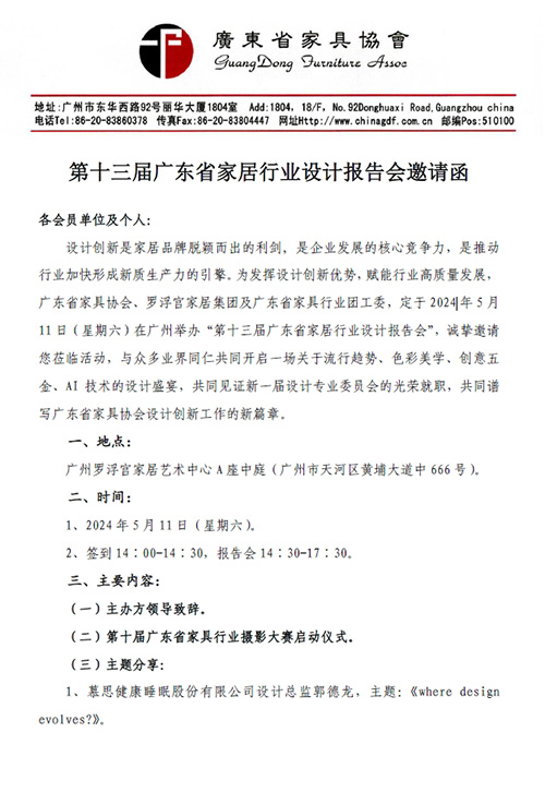 第十三届广东省家居行业设计报告会邀请函 2024-4-29 来源:广东省家具协会