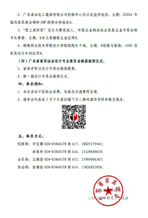 各会员单位及个人: 设计创新是家居品牌脱颖而出的利剑, 是企业发展的核心竞争力,是推动行业加快形成新质生产力的引擎。为发挥设计创新优势,赋能行业高质量发展,广东省家具协会、罗浮宫家居集团及广东省家具行业团工委,定于2024年5月11日(星期六)在广州举办“第十三届广东省家居行业设计报告会”,诚挚邀请您莅临活动,与众多业界同仁共同开启一场关于流行趋势、色彩美学、创意五金、AI技术的设计盛宴,共同见证新一届设计专业委员会的光荣就职,共同谱写广东省家具协会设计创新工作的新篇章。 一、地点: 广州罗浮宫家居艺术中心A座中庭(广州市天河区黄埔大道中666号)。 二、时间: 1、2024年5月11日(星期六)。 2、签到14∶00-14∶30,报告会14∶30-17∶30。 三、主要内容: (一)主办方领导致辞。 (二)第十届广东省家具行业摄影大赛启动仪式。 (三)主题分享: 1、慕思健康睡眠股份有限公司设计总监郭德龙,主题:《where design evolves?》。 2、广东漆加化工集团有限公司创新中心设计总监李佳欣,主题:《2024年国内家具展会调研CMF趋势分析报告》。 3、“爱上美好家”设计大赛发起人、中国五金制品协会家居五金专委会秘书长薛蓉,主题:《米兰展橱柜五金应用》。 4、顺德职业技术学院设计学院副院长干珑,主题:《创新与智能:AIGC在家具设计中的应用》。 (四)广东省家具协会设计专业委员会换届就职仪式。 1、宣读并审议设计专委会换届提案。 2、新一届设计专委会就职仪式。 四、参会须知: 1、本次活动不收取会务费,住宿及交通费用自理。 2、请参会代表在5月9日前扫描下方二维码填写资料并提交报名。