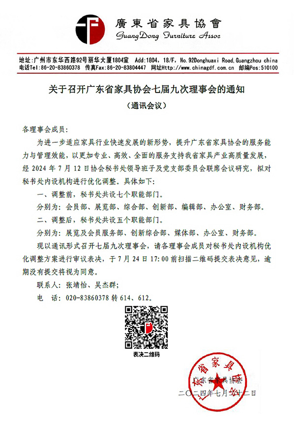各理事会成员: 为进一步适应家具行业快速发展的新形势,提升广东省家具协会的服务能力与管理效能,以更加专业、高效、全面的服务支持我省家具产业高质量发展,经2024年7月12日协会秘书处领导班子及党支部委员会联席会议研究,拟对秘书处内设机构进行优化调整。具体如下: 一、调整前,秘书处共设七个职能部门。 分别为:会员部、展览部、综合部、创新部、编辑部、办公室(党办)、财务部。 二、调整后,秘书处共设五个职能部门。 分别为:展览及会员服务部、创新综合部、媒体部、办公室(党办)、财务部。 现以通讯形式召开七届九次理事会,请各理事会成员对秘书处内设机构优化调整方案进行审议表决,于7月24日17:00前扫描二维码提交表决意见,逾期没有提交将视为同意。 联系人:张靖怡、吴杰群;