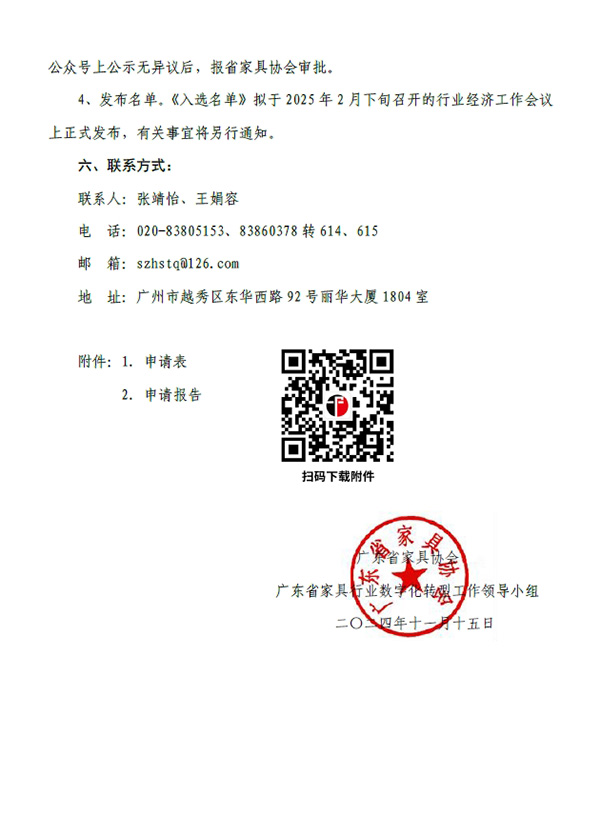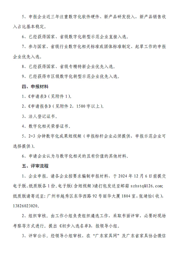 各有关企业: 为全面贯彻落实省工信厅《广东省实施消费品工业“数字三品”行动方案(2022-2025年)》《广东省家具行业数字化转型指引》精神,根据《广东省家具行业数字化转型工作实施方案》《关于培育广东省家具行业数字化转型标杆、示范企业和服务示范平台等遴选办法》工作要求,广东省家具行业数字化转型工作领导小组(简称:领导小组)组织开展第二批数字化转型标杆、示范企业遴选培育工作,以推动传统家具企业提质、降本、增效、绿色、安全发展。现将有关事项通知如下: 一、申报主体 十九大以来,在我省家具行业数字化转型和共建生态圈工作中成效显著,表现突出的家具生产、家具销售、家具设计、原辅材料生产、智能家具设备企业。【说明:已于2023年参与第一批标杆示范企业遴选的无需再次申报。】 二、基本原则 1、坚持自愿申报、免费参加原则。 2、坚持公平、公正、公开,综合评定、择优遴选原则。 3、广东省家具行业数字化转型工作小组(简称:工作小组)必要时将对申报单位现场考察。 三、申报条件 (一)培育数字化示范企业基本条件 1、申报企业在广东省内依法设立满3年以上,具有独立法人资格且经营良好。 2、申报企业未被列入“信用中国(广东)”网站严重失信主体名单,在生产经营中无发生重大生产安全事故、环境污染事故和存在严重产品质量等问题。 3、申报企业应组织健全、技术先进、效益优良,在我省家具行业数字化转型和参与共建生态圈工作中取得成效,位于行业前列,具有示范作用。 4、申报企业近三年主营业务收入,基本稳定。 5、申报企业近三年注重数字化软件硬件、新产品研发投入,新产品销售收入占比基本稳定。 6、已经获得市区级数字化转型示范企业优先入选。 7、参与省级、市区级行业数字化相关团体标准制定、起草工作的申报企业优先入选。 8、已经获得市区级专精特新企业优先入选。 (二)培育数字化标杆企业基本条件 1、申报企业在广东省内依法设立满3年以上,具有独立法人资格且经营良好。 2、申报企业未被列入“信用中国(广东)”网站严重失信主体名单,在生产经营中无发生重大生产安全事故、环境污染事故和存在严重产品质量等问题。 3、申报企业应组织健全、技术先进、效益优良,在我省家具行业数字化转型和积极参与共建生态圈工作中成效显著,处于行业领先地位,具有标杆作用。 4、申报企业近三年主营业务收入,基本稳定。 5、申报企业近三年注重数字化软件硬件、新产品研发投入,新产品销售收入占比基本稳定。 6、已经获得国家、省级数字化转型示范企业直接入选。 7、参与国家、省级行业数字化相关标准或团体标准制定、起草工作的申报企业优先入选。 8、已经获得国家、省级专精特新企业优先入选。 9、已经获得市区级数字化转型示范企业优先入选。 四、申报材料 1、《申请表》(见附件1)。 2、《申请报告》(见附件2,1500字以上)。 3、法人登记证书。 4、数字化相关荣誉证书。 5、2-3分钟数字化成果短视频(申报标杆企业必须提供,申报示范企业可选择提供)。 6、申请企业认为与数字化相关的且有价值的其他材料。 五、评审流程 1、企业申报。请各企业按要求编制申报材料,于2024年12月6日前提交电子版、纸质版各1份。电子版(含短视频)请打包发送至邮箱szhstq@126.com;纸质版请寄送至:广州市越秀区东华西路92号丽华大厦1804室,张靖怡(收),13826023020。 2、组织审核。由工作小组负责组织遴选工作,采取书面评审,必要时现场考察等方式进行。提出《初步入选名单》,报领导小组。 3、评审公示。经领导小组审核,在“广东家具网”及广东省家具协会微信公众号上公示无异议后,报省家具协会审批。 4、发布名单。《入选名单》拟于2025年2月下旬召开的行业经济工作会议上正式发布,有关事宜将另行通知。 六、联系方式 联系人:张靖怡、王娟容 电 话:020-83805153、83860378转614、615 邮 箱:szhstq@126.com 地 址:广州市越秀区东华西路92号丽华大厦1804室