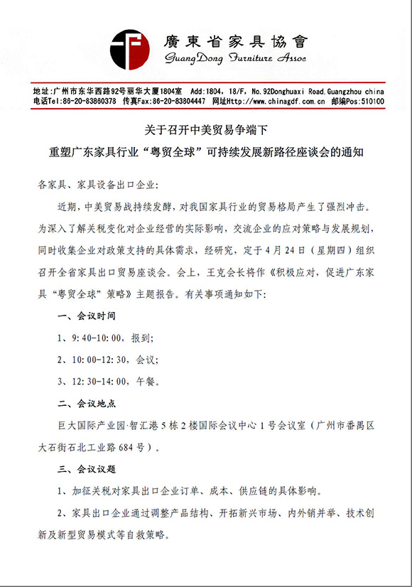 关于召开中美贸易争端下重塑广东家具行业“粤贸全球” 2025-4-21 来源:广东省家具协会