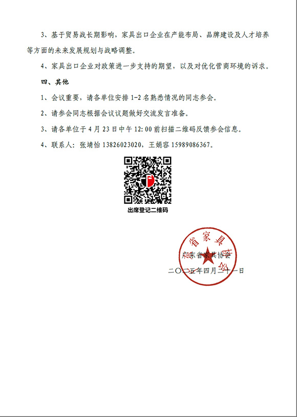 各家具、家具设备出口企业: 近期,中美贸易战持续发酵,对我国家具行业的贸易格局产生了强烈冲击。为深入了解关税变化对企业经营的实际影响,交流企业的应对策略与发展规划,同时收集企业对政策支持的具体需求,经研究,定于4月24日(星期四)组织召开全省家具出口贸易座谈会。会上,王克会长将作《积极应对,促进广东家具“粤贸全球”策略》主题报告。有关事项通知如下: 一、会议时间 1、9:40-10:00,报到; 2、10:00-12:30,会议; 3、12:30-14:00,午餐。 二、会议地点 巨大国际产业园·智汇港5栋2楼国际会议中心1号会议室(广州市番禺区大石街石北工业路684号)。 三、会议议题 1、加征关税对家具出口企业订单、成本、供应链的具体影响。 2、家具出口企业通过调整产品结构、开拓新兴市场、内外销并举、技术创新及新型贸易模式等自救策略。 3、基于贸易战长期影响,家具出口企业在产能布局、品牌建设及人才培养等方面的未来发展规划与战略调整。 4、家具出口企业对政策进一步支持的期望,以及对优化营商环境的诉求。 四、其他 1、会议重要,请各单位安排1-2名熟悉情况的同志参会。 2、请参会同志根据会议议题做好交流发言准备。 3、请各单位于4月23日中午12:00前扫描二维码反馈参会信息。 4、联系人:张靖怡13826023020,王娟容15989086367。